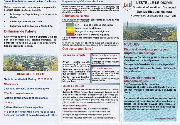 - Risque de pluie-inondations de plaine ou rupture de l'un des trois grands barrages, situés en amont de notre village, en l'occurrence ceux de l'OULE, du PORTILLON et de CAP de LONG.